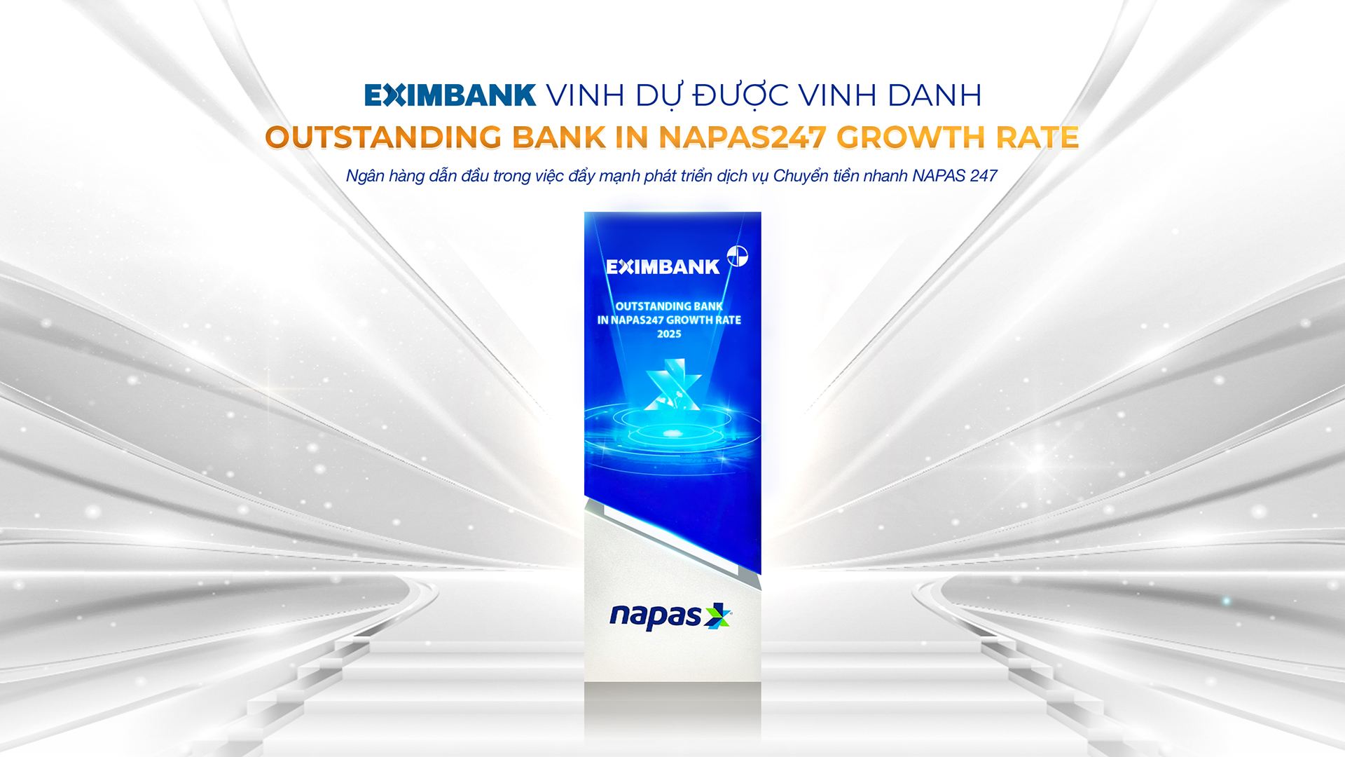 Tại Hội nghị Tổ chức thành viên NAPAS 2025, Eximbank được vinh danh với giải thưởng “Outstanding Bank in NAPAS247 Growth Rate”, ghi nhận ngân hàng dẫn đầu về tốc độ tăng trưởng dịch vụ Chuyển tiền nhanh NAPAS 247. Với mức tăng trưởng 423,8%, Eximbank khẳng định nỗ lực chuyển đổi số và góp phần thúc đẩy thanh toán không dùng tiền mặt tại Việt Nam.