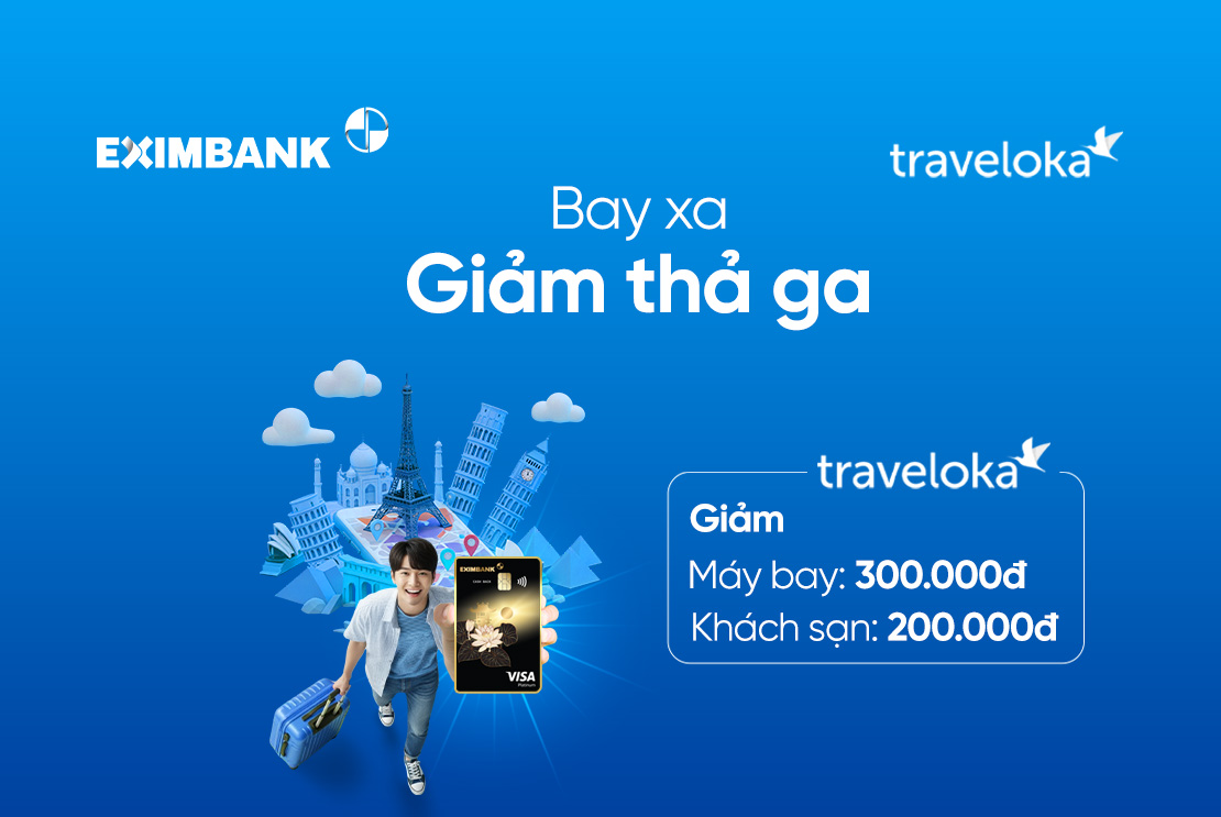 Chỉ cần đặt vé máy bay hoặc phòng khách sạn trên Traveloka và thanh toán bằng thẻ tín dụng cá nhân Eximbank sẽ được nhận ưu đãi giảm giá hấp dẫn trong thời gian khuyến mại.