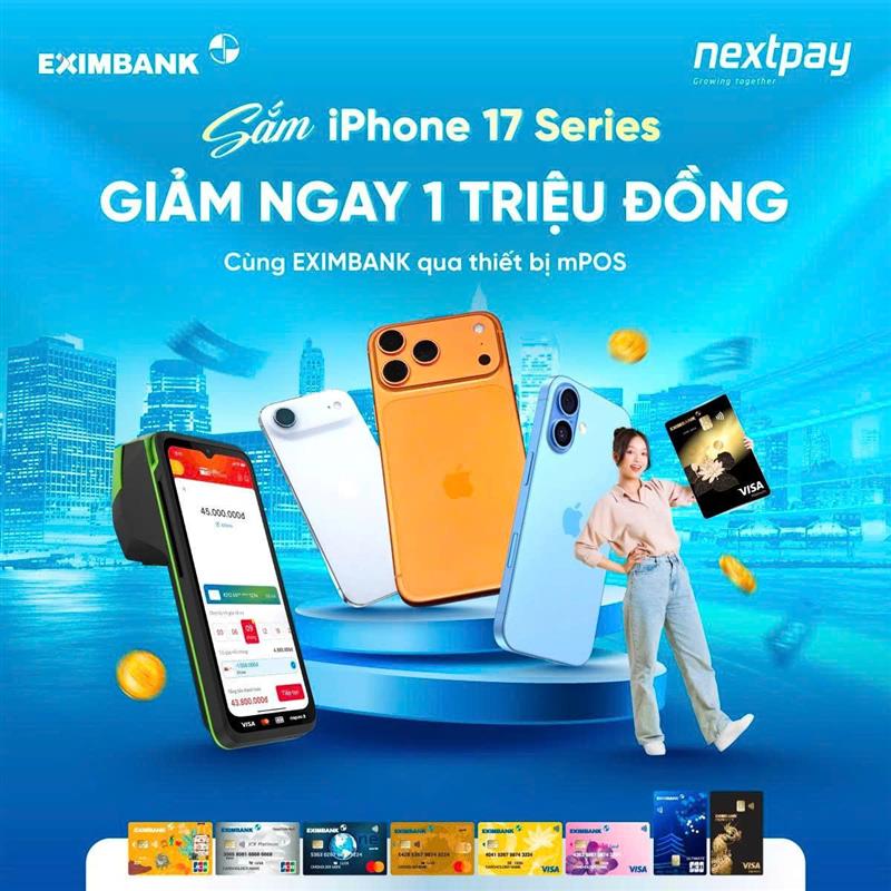 - Ưu đãi: Giảm ngay 1.000.000 VNĐ khi mua iPhone 17 Series và thanh toán trả góp bằng thẻ tín dụng Eximbank tại hệ thống MPOS của các đại lý: CellphoneS, Di Động Việt, Minh Tuấn Mobile, ClickBuy.