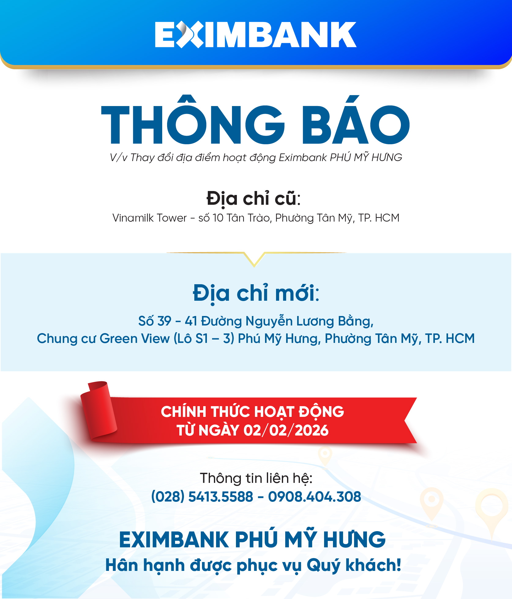 EXIMBANK THÔNG BÁO THAY ĐỔI ĐỊA ĐIỂM HOẠT ĐỘNG CỦA EXIMBANK PHÚ MỸ HƯNG