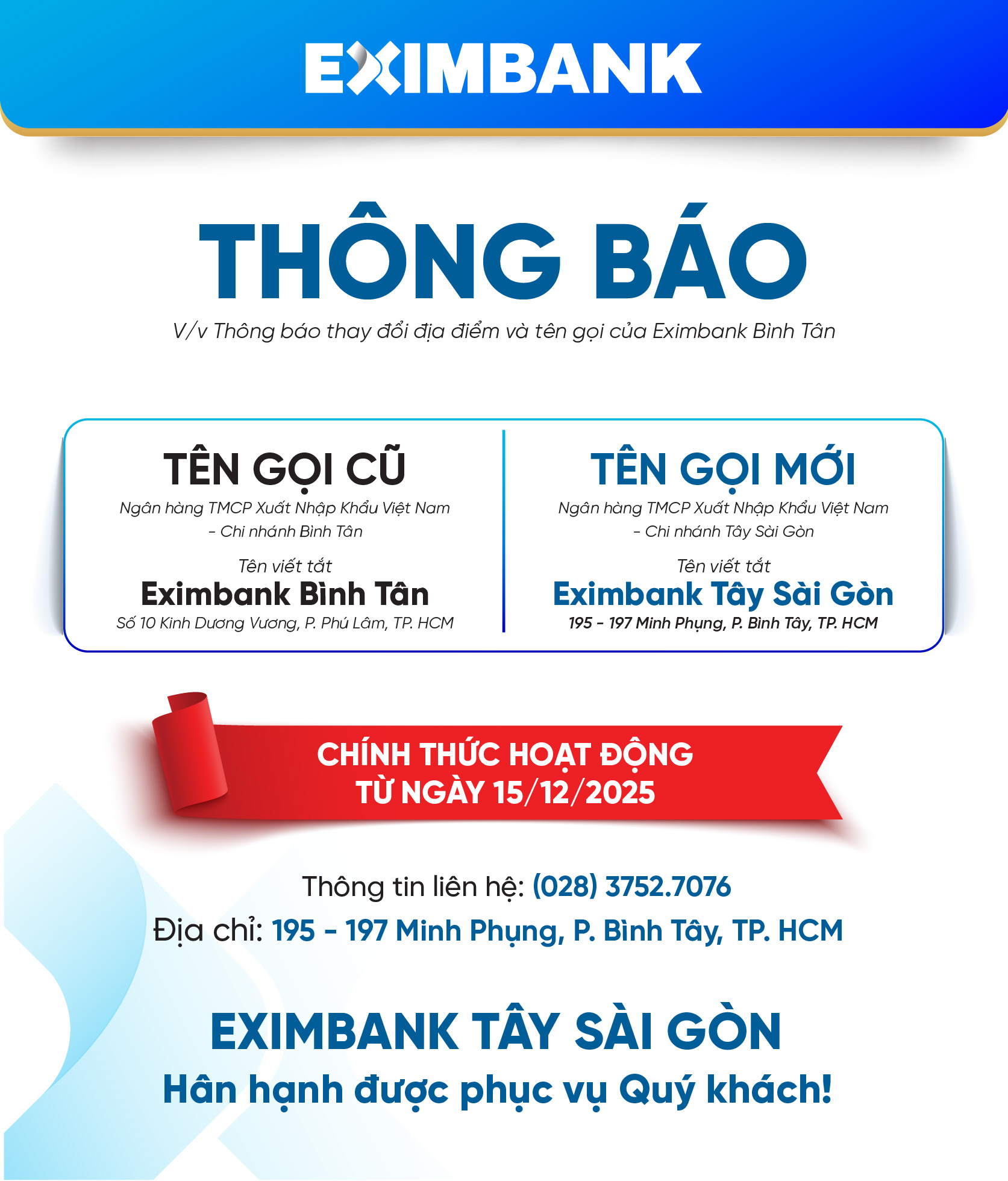 EXIMBANK THÔNG BÁO THAY ĐỔI ĐỊA ĐIỂM VÀ TÊN GỌI CỦA EXIMBANK BÌNH TÂN