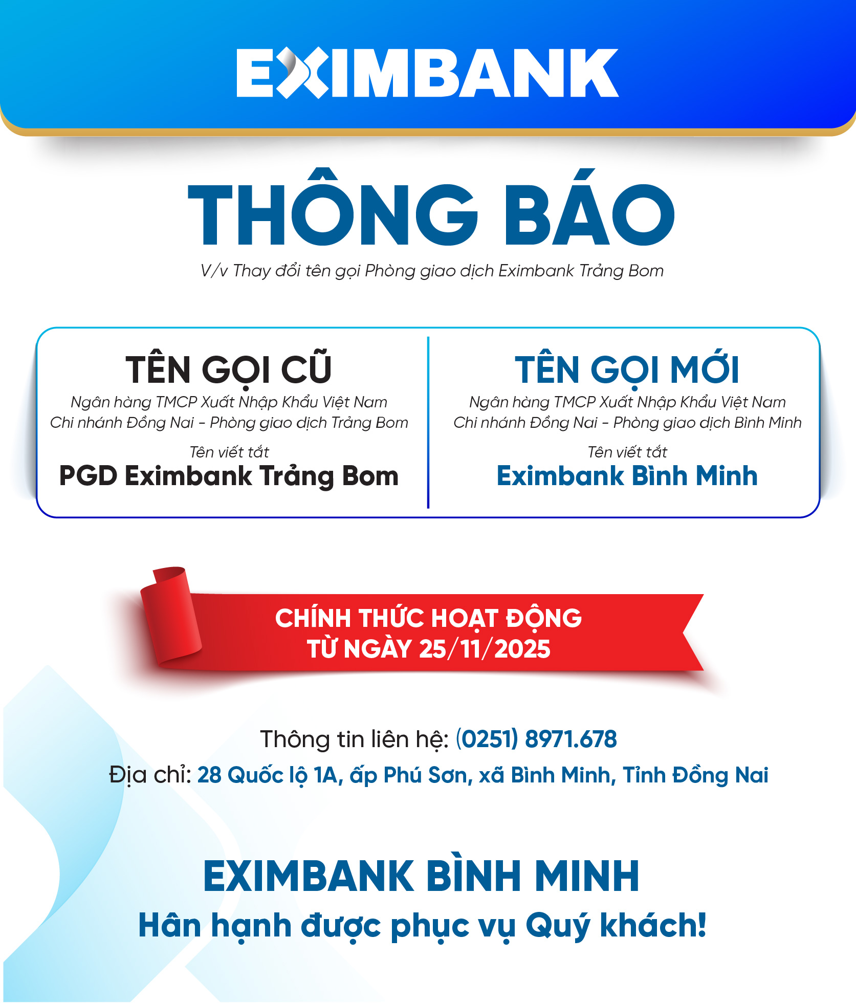 EXIMBANK THÔNG BÁO THAY ĐỔI TÊN GỌI PHÒNG GIAO DỊCH TRẢNG BOM
