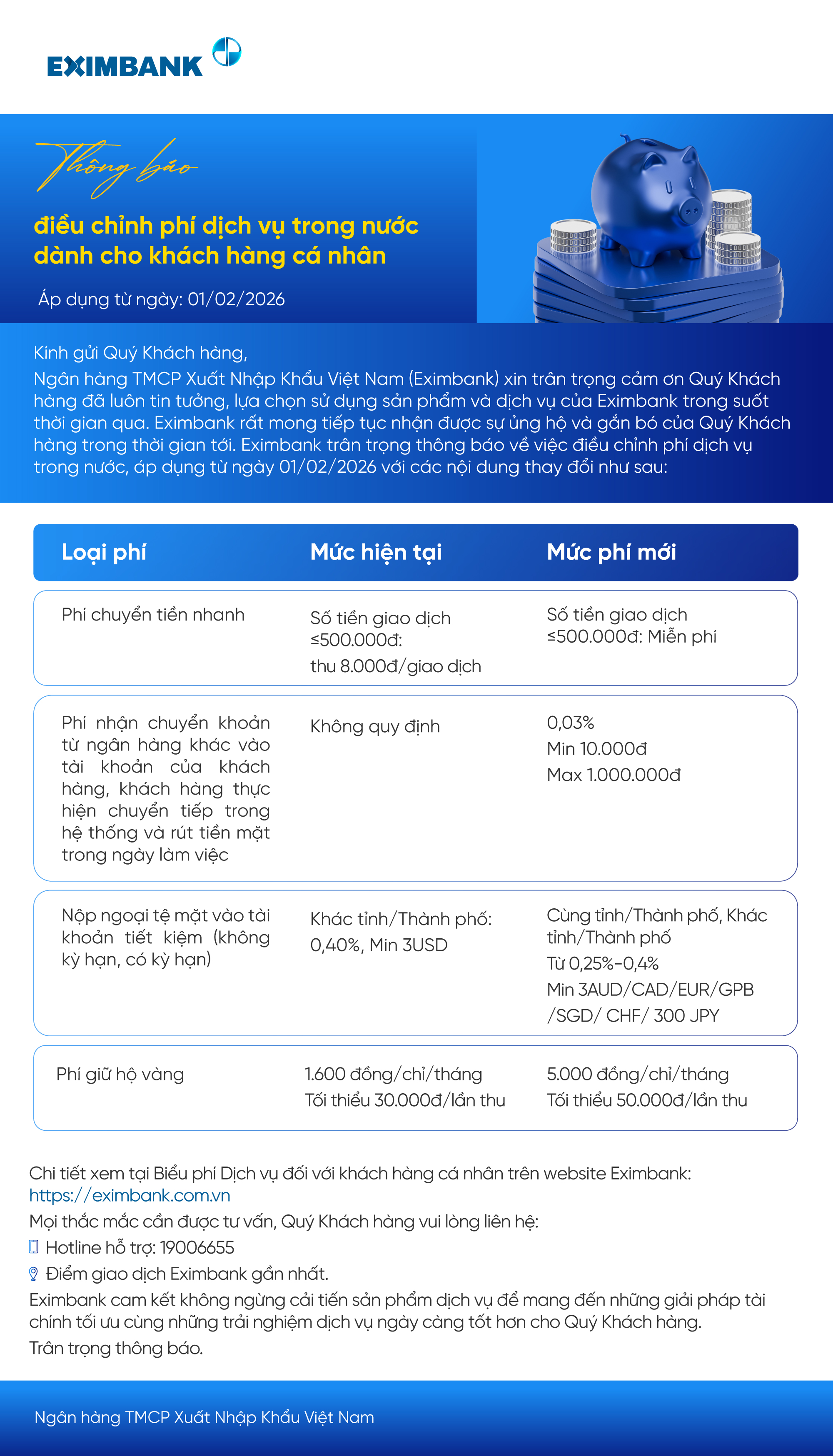 THÔNG BÁO ĐIỀU CHỈNH PHÍ DỊCH VỤ TRONG NƯỚC DÀNH CHO KHÁCH HÀNG CÁ NHÂN (Áp dụng từ ngày 01/02/2026)