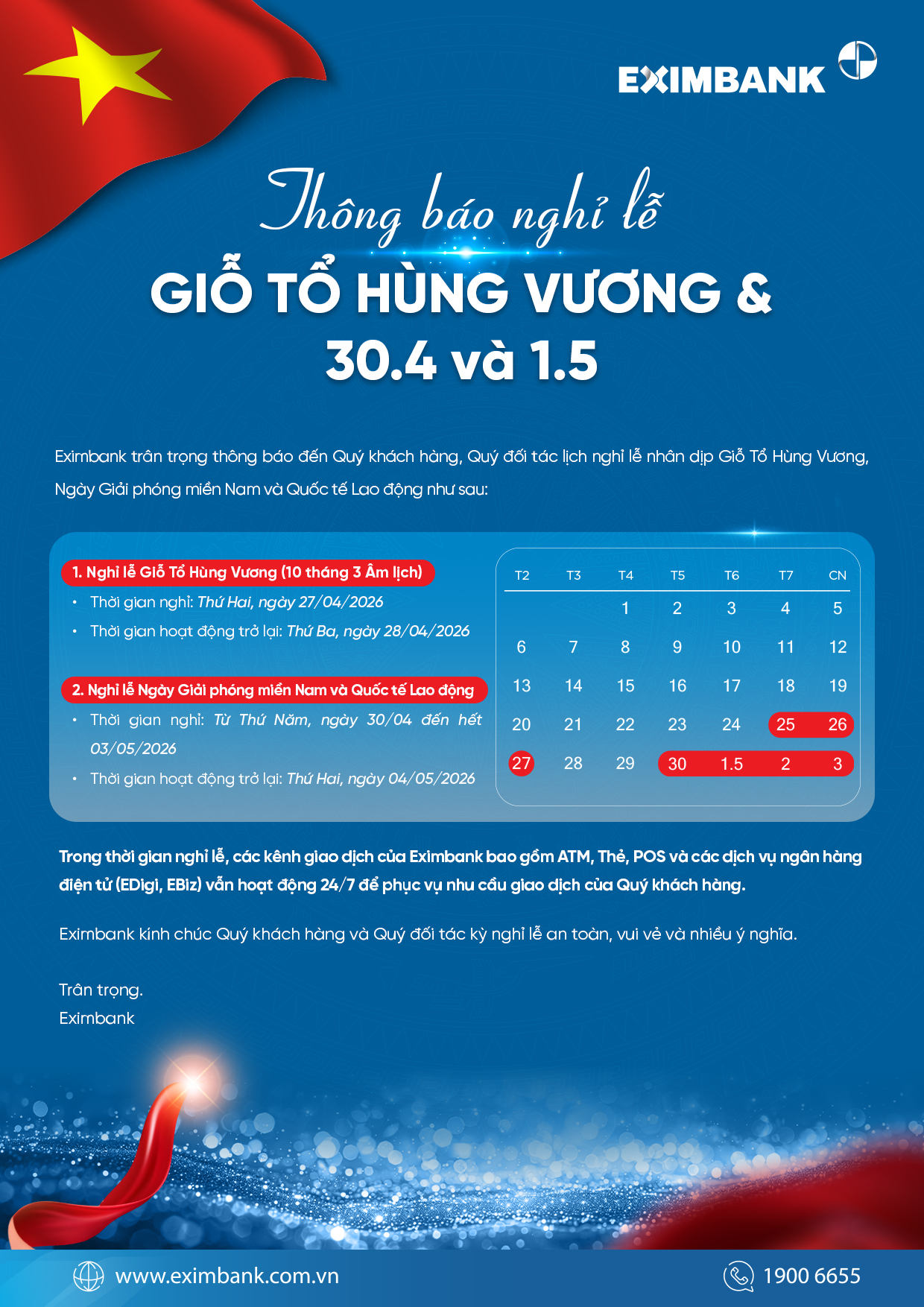 THÔNG BÁO NGHỈ LỄ GIỖ TỔ HÙNG VƯƠNG & GIẢI PHÓNG MIỀN NAM 30/4 VÀ QUỐC TẾ LAO ĐỘNG 1/5