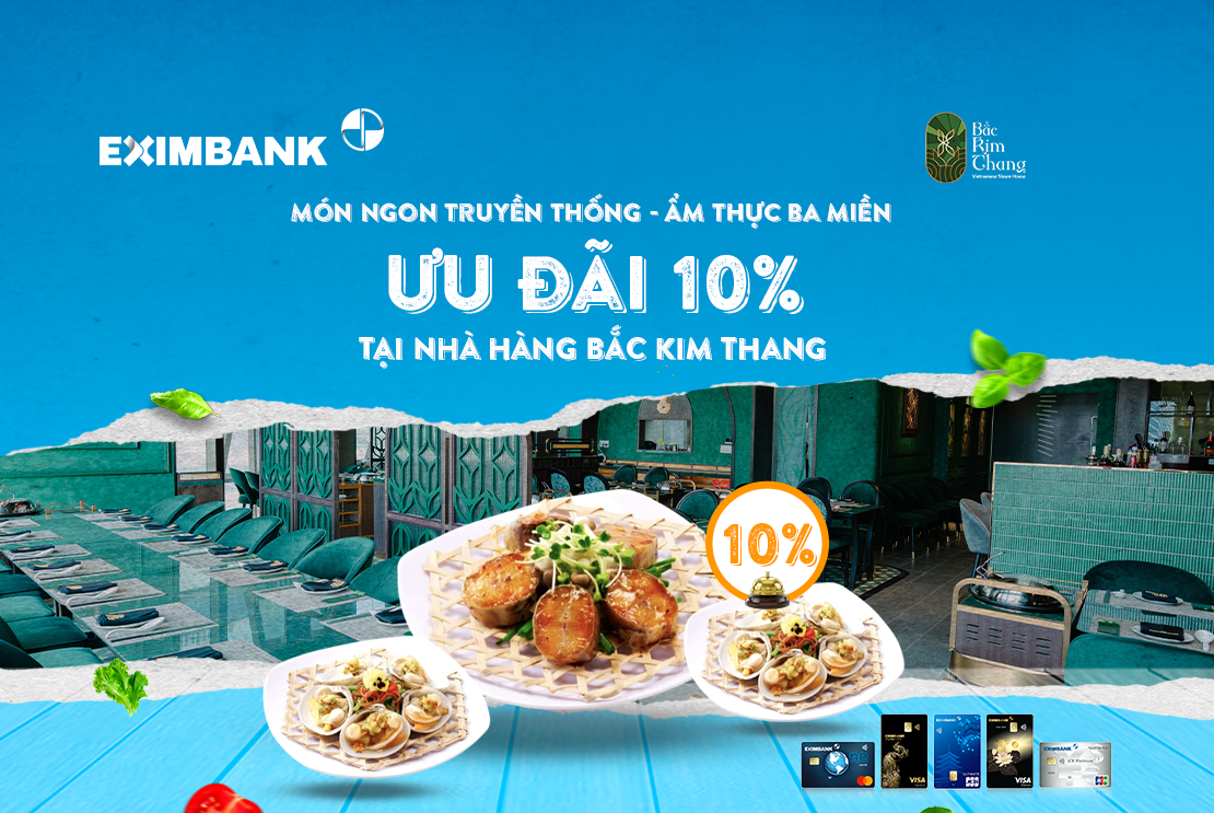 Cùng Eximbank thưởng thức hương vị truyền thống, nơi hội tụ các món ăn đậm đà bản sắc của ẩm thực ba miền. Giảm 10% khi Quý khách thanh toán bằng thẻ Eximbank tại chuỗi nhà hàng Bắc Kim Thang, và tặng kèm món "Chả giò Bắc Kim Thang" khi đi từ 4 khách