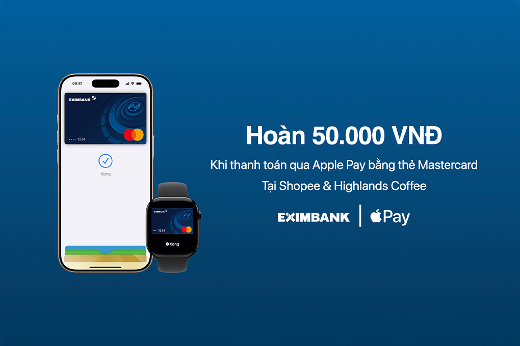 - Hoàn tiền 50.000đ khi thanh toán qua Apple Pay liên kết với thẻ Eximbank hợp lệ, với giá trị giao dịch từ 100.000đ.