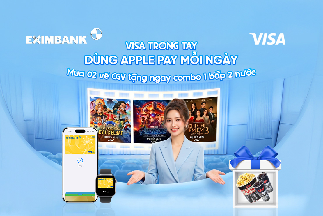 Mua 02 vé CGV tặng combo miễn phí 1 bắp 2 nước với thẻ Eximbank Visa Apple Pay